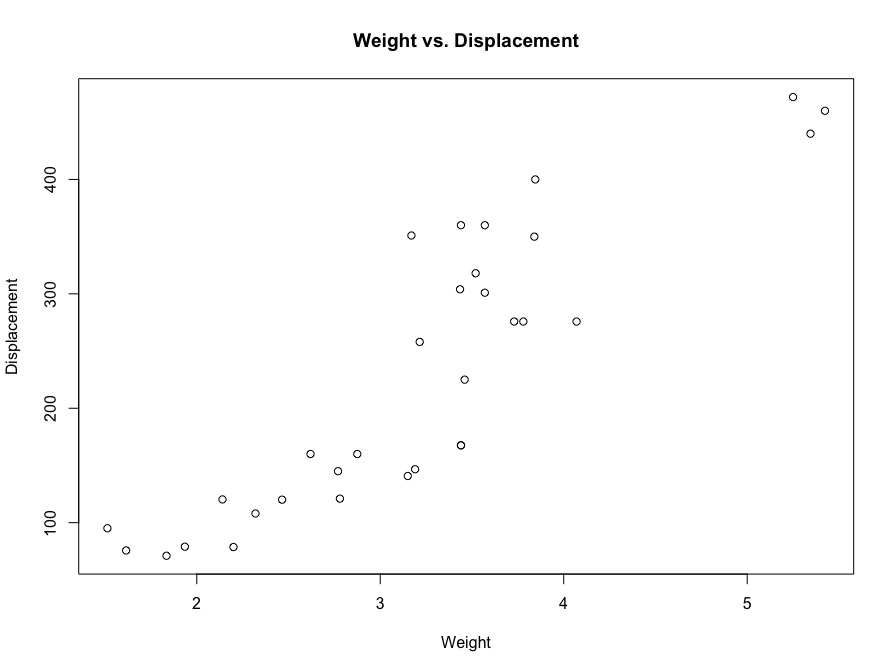 plot(mtcars$wt, mtcars$disp, xlab = "Weight", ylab = "Displacement", title("Weight vs. Displacement"))